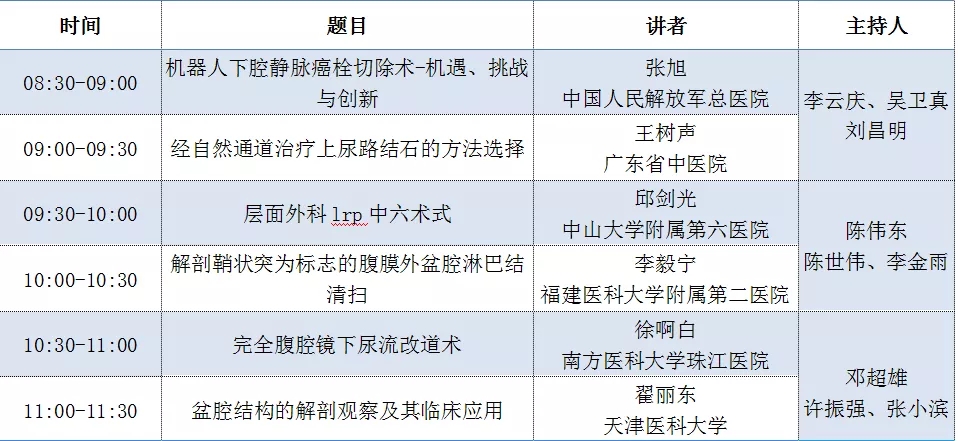 值得关注的是,2019年10月27日08:00-17:00 ,包括机器人下腔静脉癌栓切除术、腹腔镜肾盂输尿管离断成型术手术策略、完全腹腔镜下尿流改道术等十几个热门手术领域的研讨和分享成为此次会议的重要环节,具体内容如下: